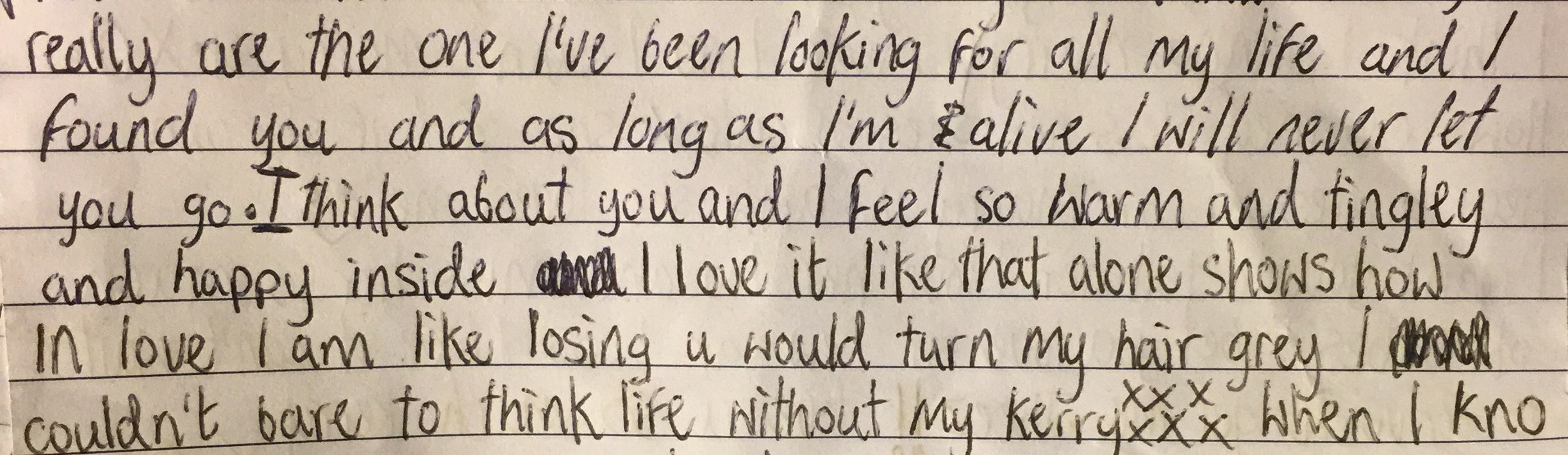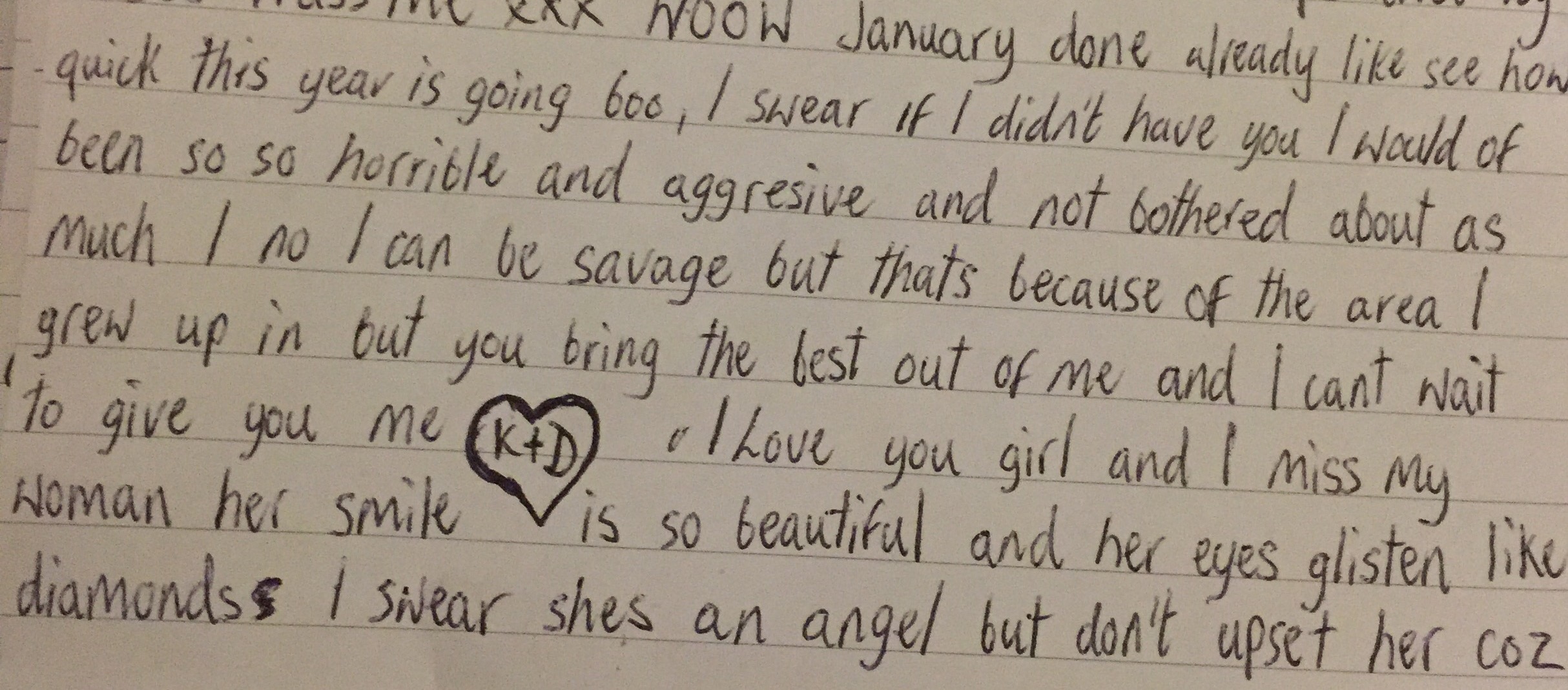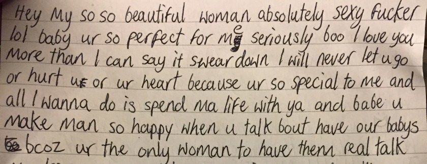 That evening brings back loads of memories. He had called his mother earlier on and asked me to look in his old prison bag. I did. All my emails, cards, pictures! FFS we were so in love! What the hell happened???!!! How did we get to this! Emails I had sent where he had underlined words and sentences. Prison is a fucked up place, and it fucked him up and I did hurt him! I felt like this was what I wanted but it still didn’t feel good.